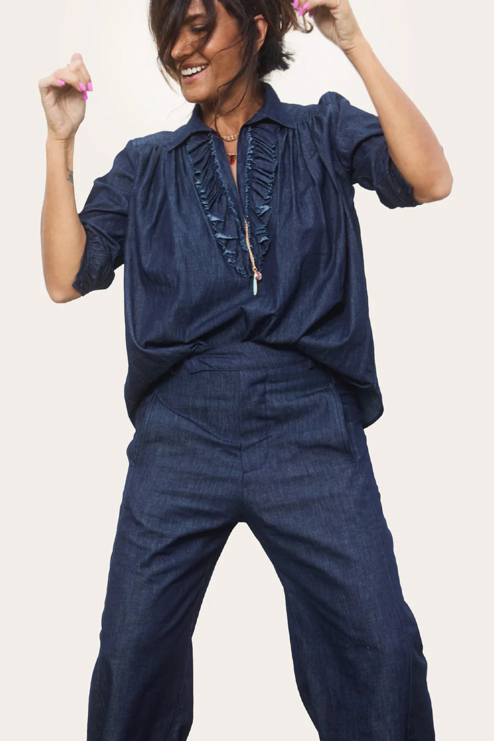 - Ruffled deep v neck with frayed edge