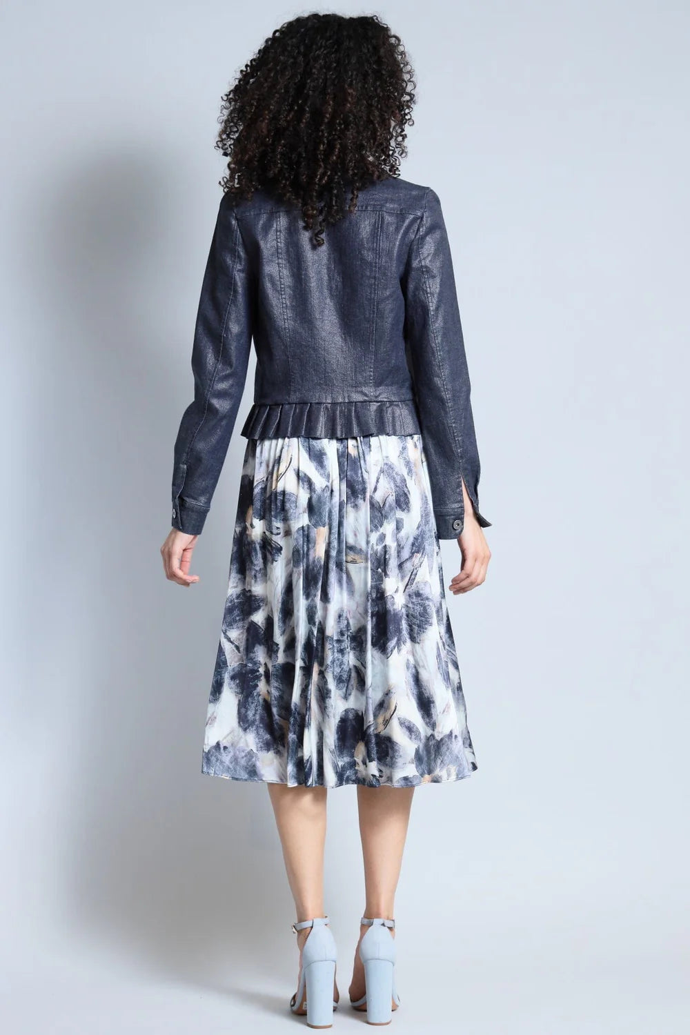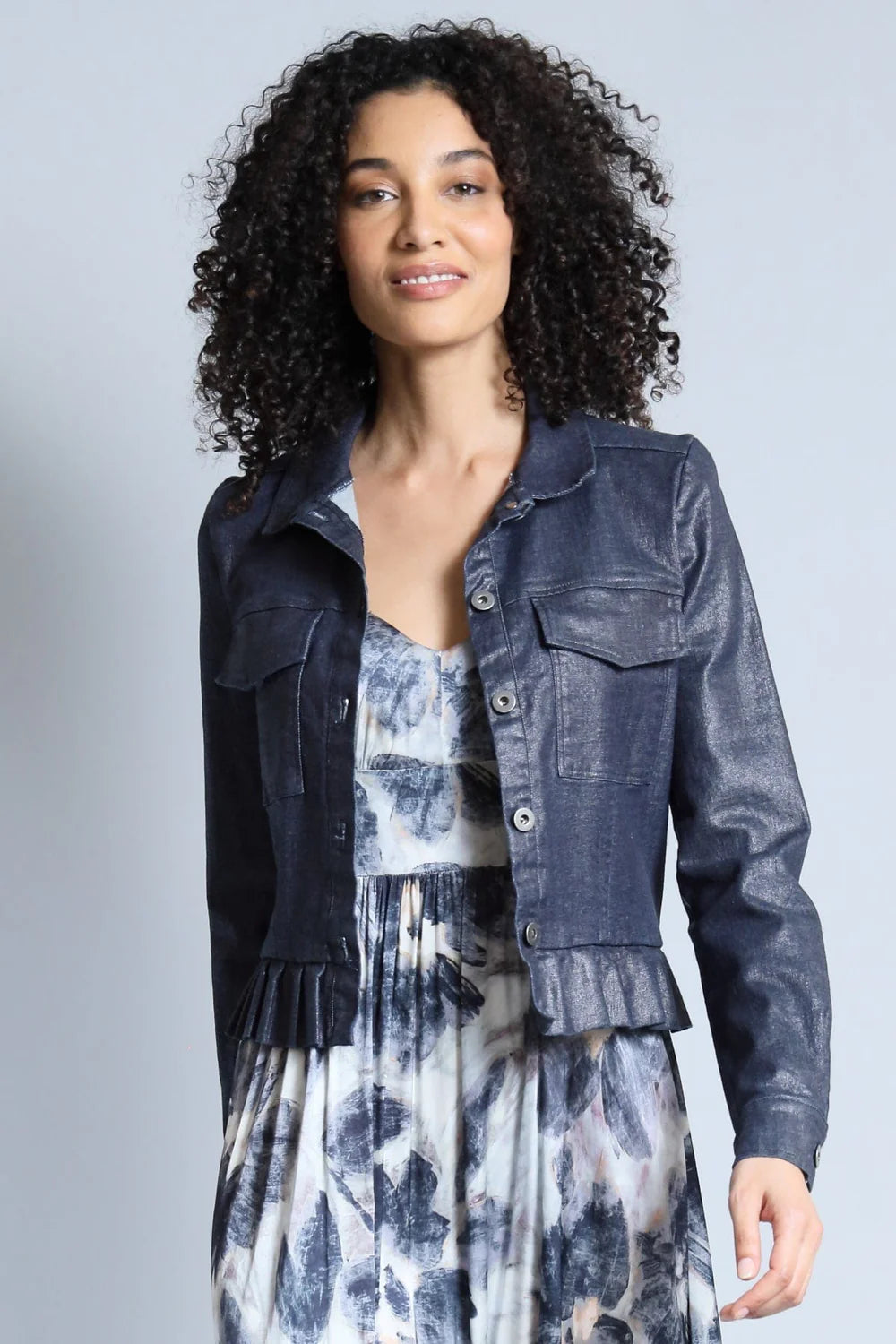 Turn heads in this Foil Denim Jacket! This statement piece offers a fresh take on a wardrobe staple. The classic denim construction provides a comfortable fit, while the foil finish and pleated ruffle bottom add a touch of unique style. Dress it up or down for a look that's effortlessly chic.