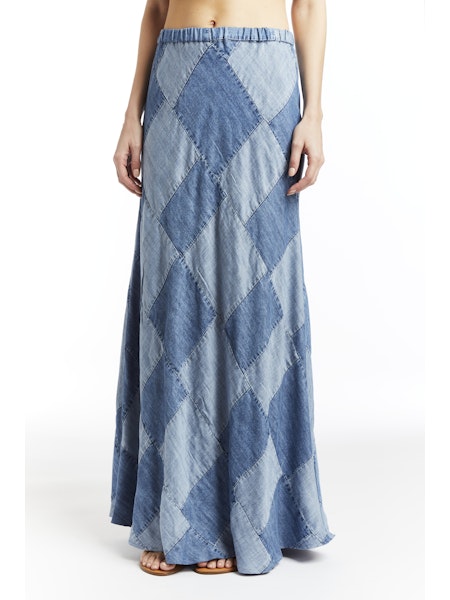 Made of patchwork denim, this maxi skirt adds a touch of wow to your basic tee or tank!
