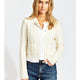 This lightweight sweater from Drew is perfect for the transition of the seasons. It's main body is a soft cream colored cable knit. It is accented at the pockets, down the center, and at the hem with a crisper white detail. Hem design is pleated into ruffles for a preppy look. This piece is a keeper!!