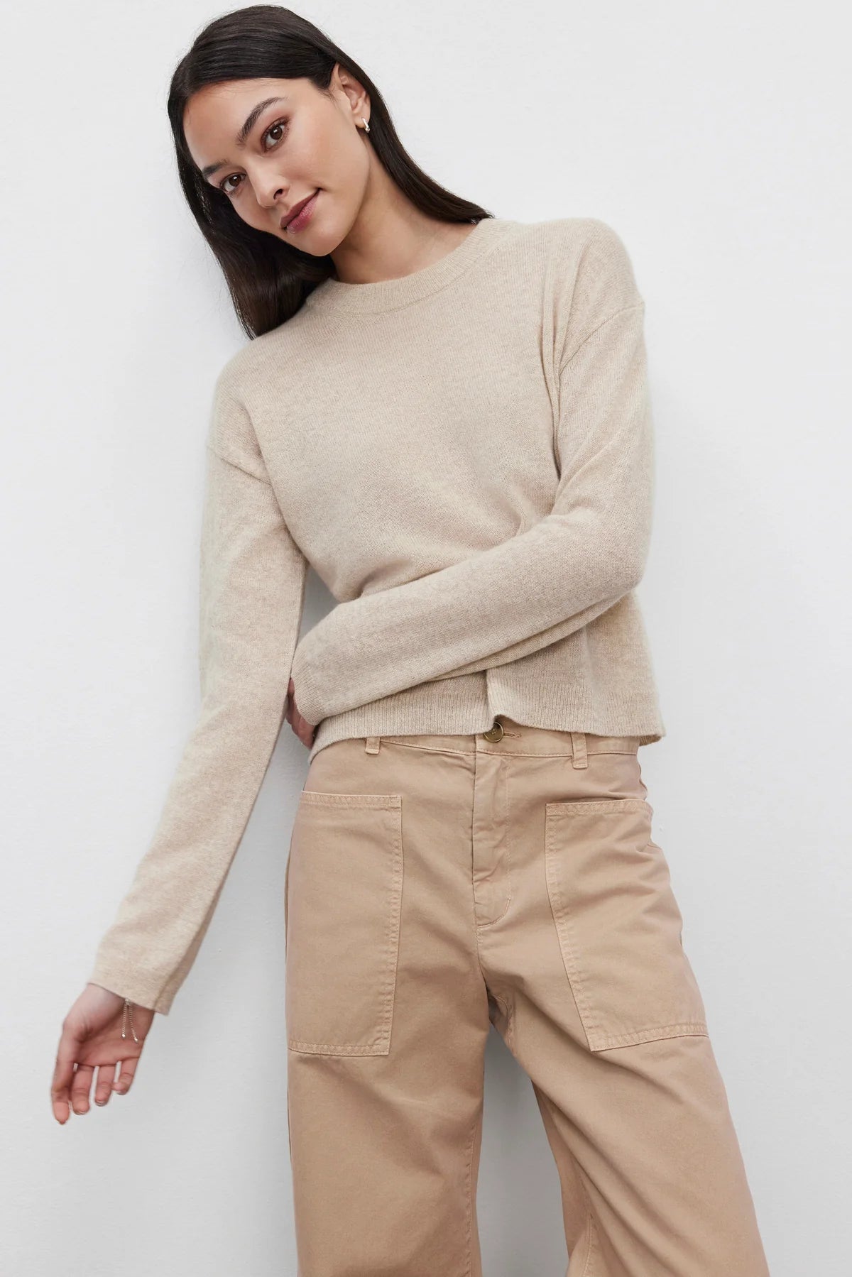 Crafted from 100% cashmere, this sweater offers ultimate softness with a crew neckline and ribbed trims. The slightly cropped design provides a contemporary look, perfect for both casual and refined outfits.