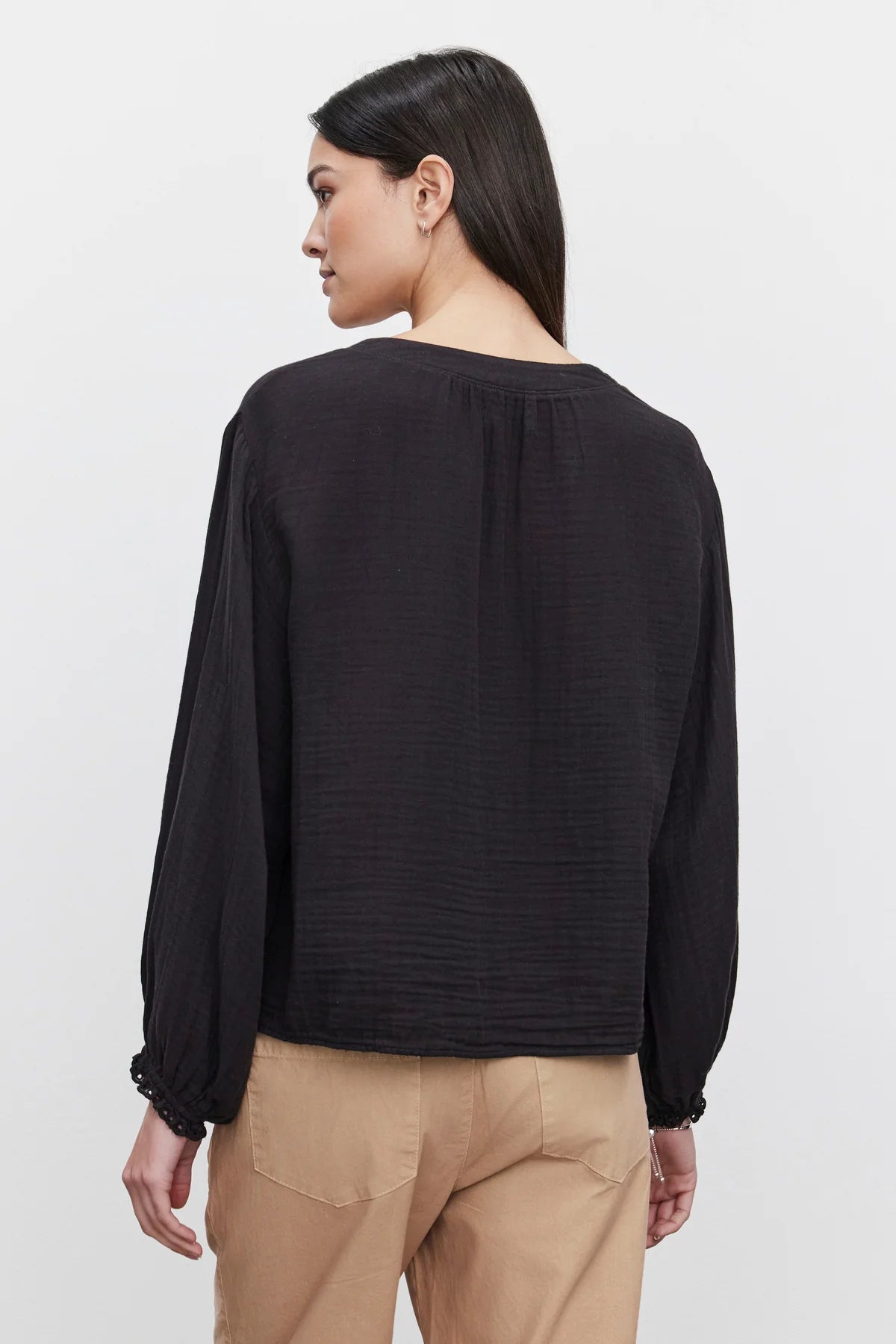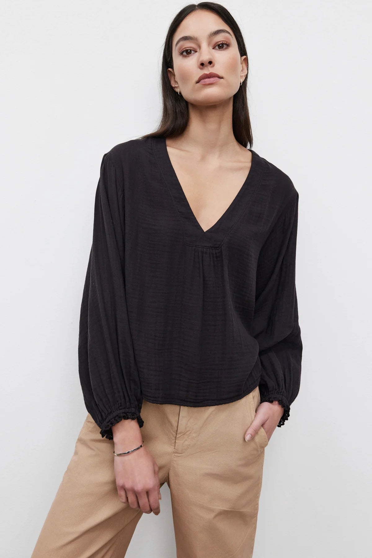 Embrace relaxed style with the Naomi Top in airy cotton gauze. Featuring a deep v-neckline and eyelet ruffle elastic cuffs, its boxy, relaxed fit offers comfort and a laid-back look for any casual occasion.